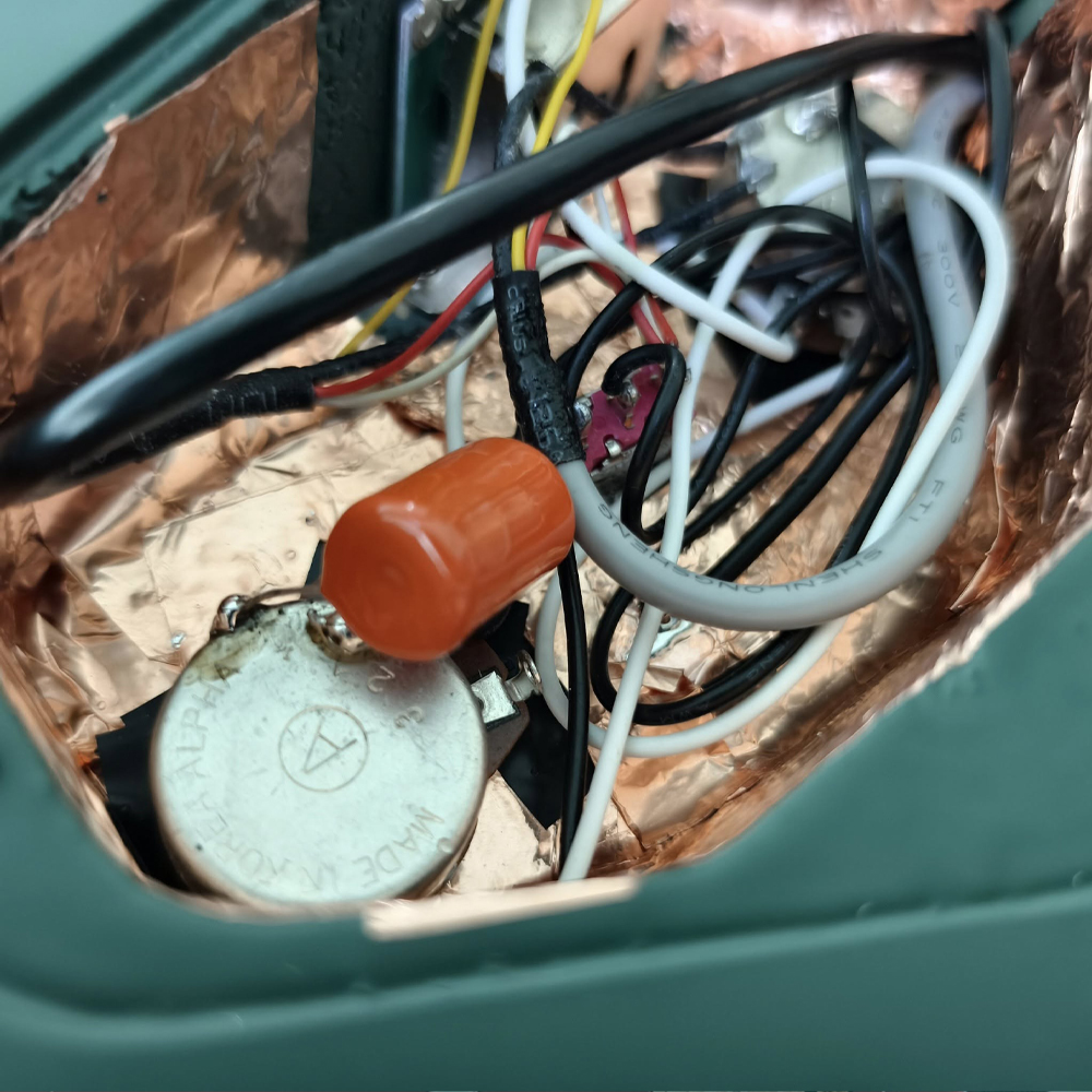 ปูฟอยล์ทองแดงใต้ปิ๊กอัพ และห้องเครื่องกีตาร์ทุกตัว เพื่อลดเสียงจี่