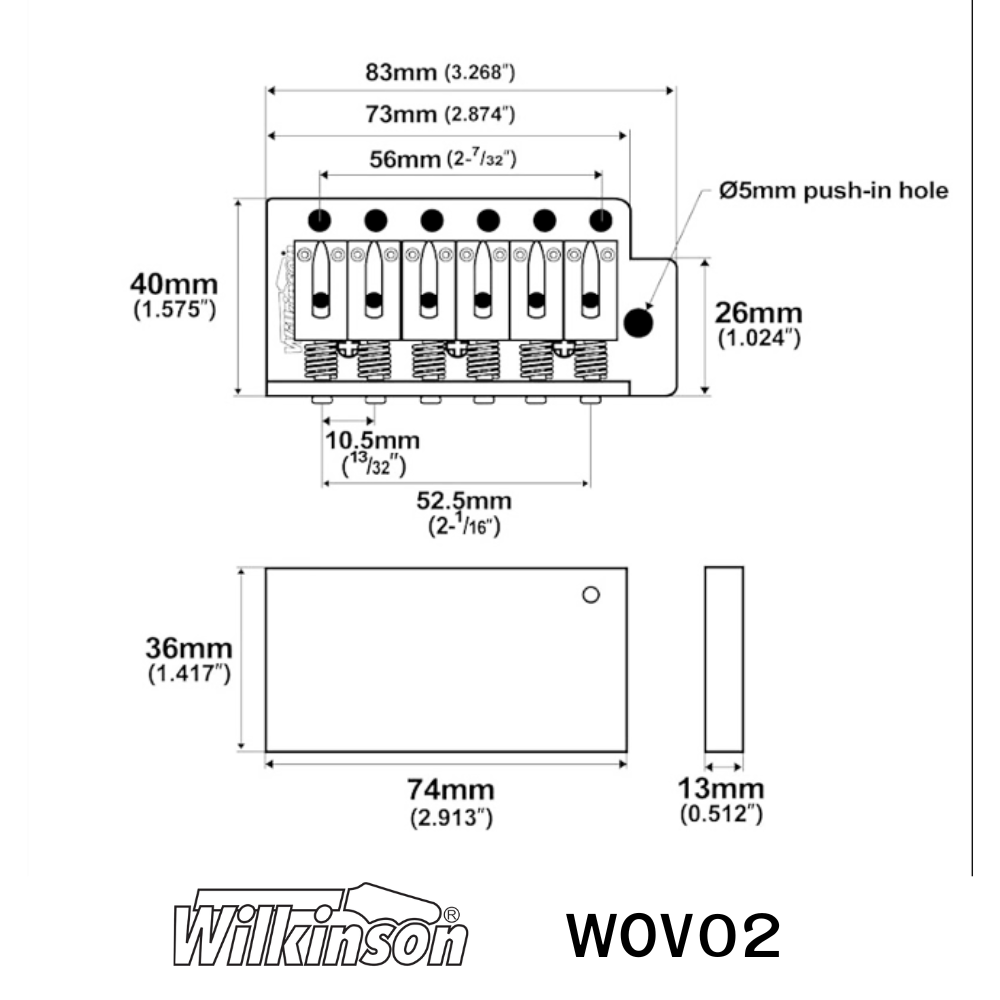 Dimensions; Base Plate;Length 83mm x Width 40mm. Strings spacing E to e 52mm. Distance between each string 10.5mm. Alloy Block;Depth 40mm, Length 73mm, Width 13mm.